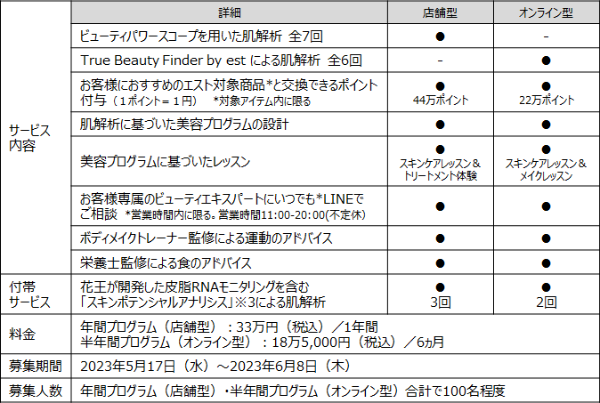 今回は、昨年β版として第一次募集を行った花王の旗艦店「BEAUTY BASE by Kao 銀座店」に通いながら対面でサービスを受けられる店舗型の年間プログラム(年間/33万円)に加え、新たにスマートフォンやパソコン等でどこからでもオンラインでサービスを受けることができるオンラインの半年間プログラム(半年間/18.5万円)の2つのプログラムについて募集をいたします。