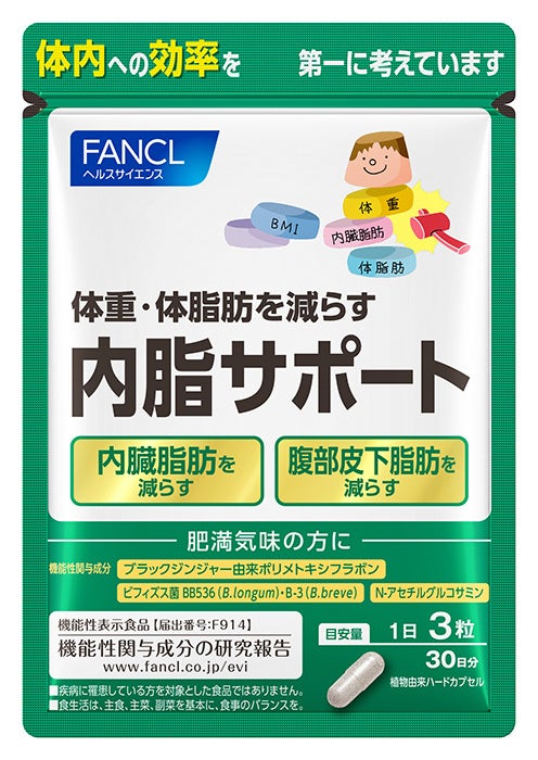 腸内環境を良好にし、体重・体脂肪を減らすことで、高めのBMIを改善する機能が報告されている2種の「ビフィズス菌」「N-アセチルグルコサミン」を配合。加えて脂肪を消費しやすくする「ブラックジンジャー(ポリメトキシフラボン)」を配合することで、おなかの脂肪(内臓脂肪・腹部総脂肪)を減らすことが報告されています。独自技術「バリア&リリース製法」で、成分を守って届けることにもこだわりました。