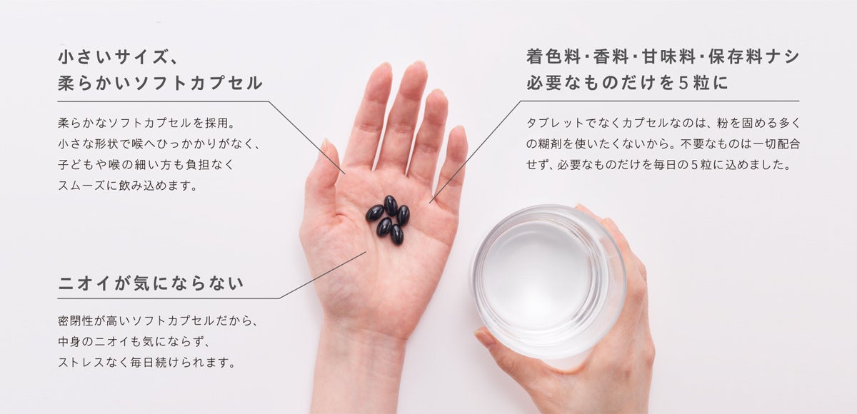 サプリメントとして不要なものは一切含めず、吸収率と品質の高さにこだわった栄養素を1日5粒にしっかり配合。