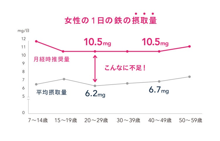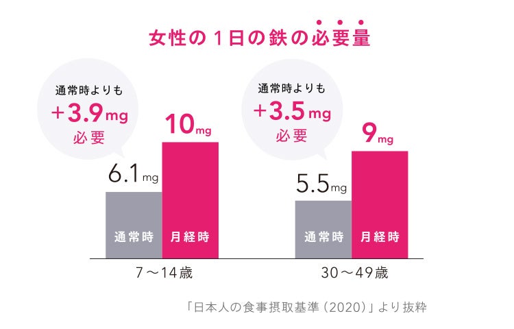 鉄は、すべての年代の女性において不足しやすい栄養素。厚生労働省によると、1日あたりの鉄の必要量は、通常時よりも月経時に格段に増え、小中学生(7〜14歳/月経あり)の場合は10mg、30〜40代の大人は9mg。