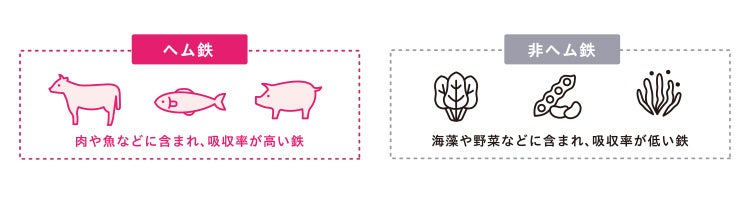 一般的に鉄は、動物性食品に多く含まれる「へム鉄」と、植物性食品に多く含まれる「非へム鉄」の2種類があります。厚生労働省によると日本人が食事から摂取する鉄の85%上が非へム鉄といわれ、吸収率が低いために摂っているつもりでも不足しがちです。