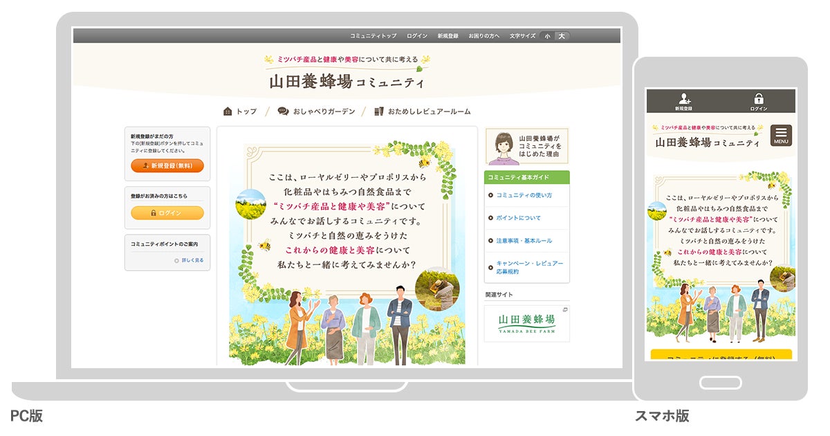 「山田養蜂場コミュニティ」は、ミツバチ産品と健康・美容がテーマのファンコミュニティです。山田養蜂場のはちみつや自然食品、ローヤルゼリーやプロポリスなどの健康食品、そして「RJ」シリーズなどの化粧品を愛用しているお客様から、「まだ試したことがない」という方まで、どなたでも参加することが可能です。ミツバチ産品の魅力や疑問、健康や美容についての対話を通して、これからの健康づくりや美容習慣を応援します。