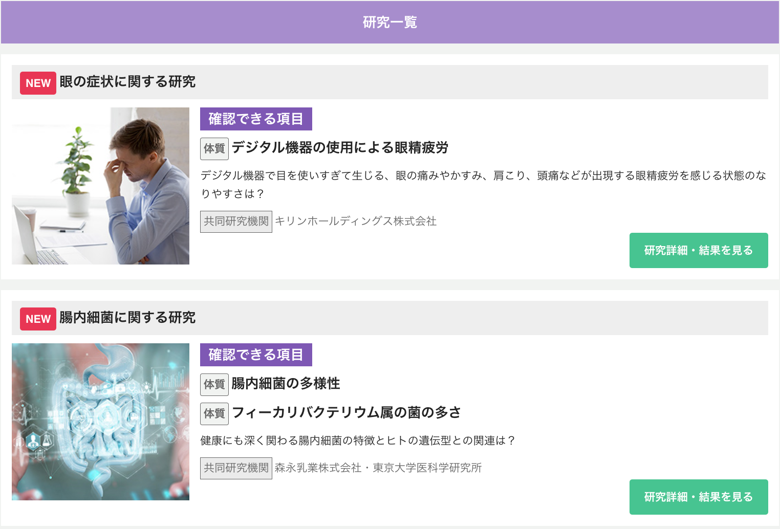 また、遺伝子検査結果の返却に併せて共同研究先が行った他の研究の情報や商品紹介も行います。