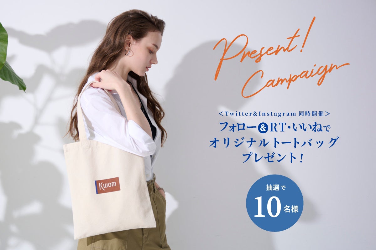 キャンペーン期間中にKwomの公式SNS(Instagram・Twitter)をフォローし、キャンペーンの投稿をRTもしくはいいね、さらに「#Kwom1周年」をつけてコメント頂いた方の中から、抽選で10名様にオリジナルトートバッグをプレゼント。