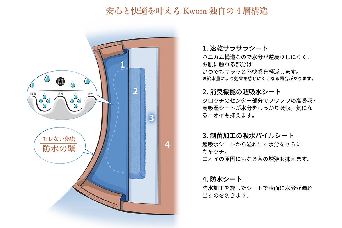 Kwomの吸水ショーツは、独自の4層構造の吸水帯と、股部分のフチに経血をしっかりせき止める『防水の壁(特許出願中)』で漏れを防止。消臭性と制菌にも優れ、表面には速乾素材を採用し、ベタつきやムレを軽減。機能性・吸水量だけでなく、デザイン性にもこだわり、オシャレを楽しむ女性ごころを魅了します。