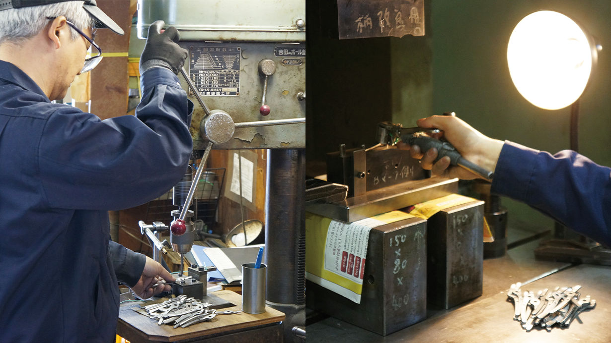 精密機器のプレス加工技術で製造。穴あけや先端加工など一人ひとりの職人たちが丁寧に製造しています。