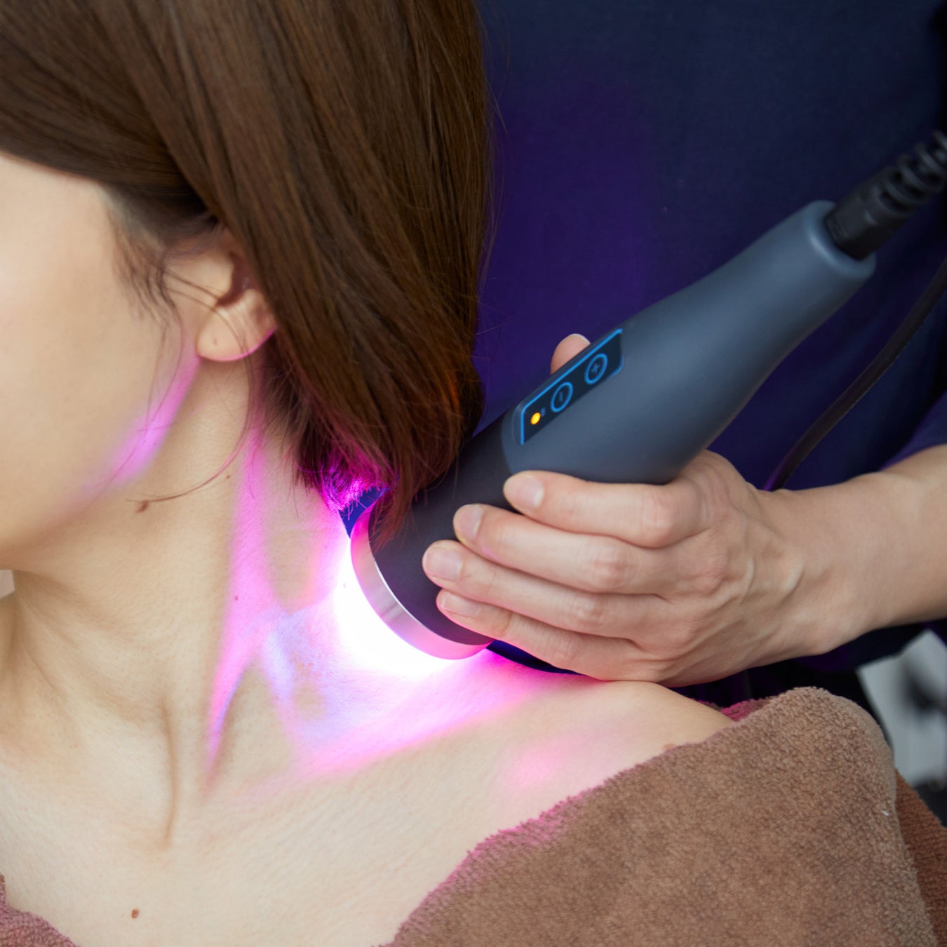 メディチャーライトヘッドスパは髪への栄養や自律神経を整えるのに大切な後頭部と首・肩周りをメインにメディチャーライトの近赤外線ライトとハイボルテージを組み合わせ照射し、身体をなかから温めます。肉に刺激を与え、肩こりと首こりにアプローチすることで身体が温まり、筋肉を緩ませてからハンドトリートメントを行うことですっきりと凝りをほぐします。