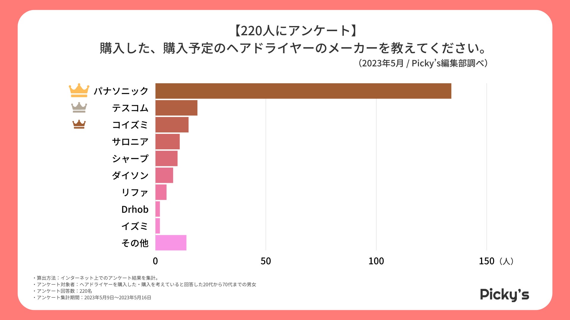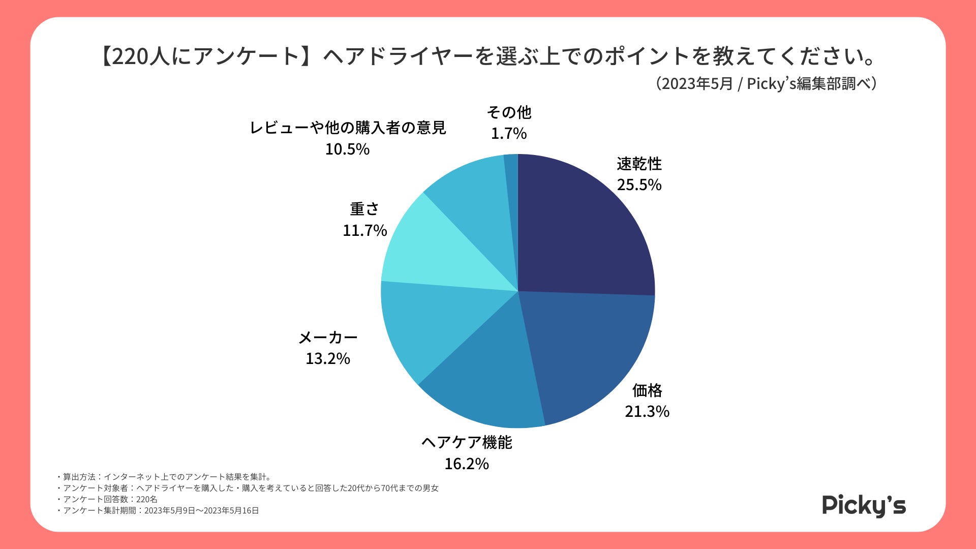 「Picky’s」は、インターネットショッピングにおいて、購入前に試せない・選ぶべきものがわからないという課題の解決を目標に、あらゆる商品のおすすめランキングや検証レビューを紹介するサイトです。このたびPicky’s(https://rentry.jp/note/)では、ヘアドライヤーについてインターネット上でアンケート調査を行いましたので発表いたします。