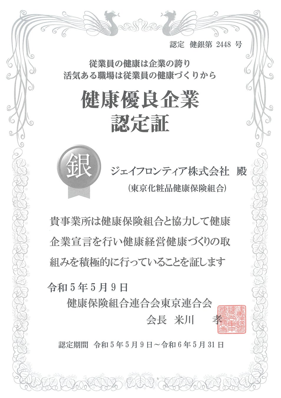 ジェイフロンティア株式会社(本社:東京都渋谷区、代表取締役社長執行役員:中村篤弘、以下「当社」)は、健康保険組合連合会東京連合会に「健康企業宣言※」を行い、積極的な健康経営への取り組みを実施し、「健康優良企業(銀の認定)」(認定 協銀第2448号)を取得いたしました。