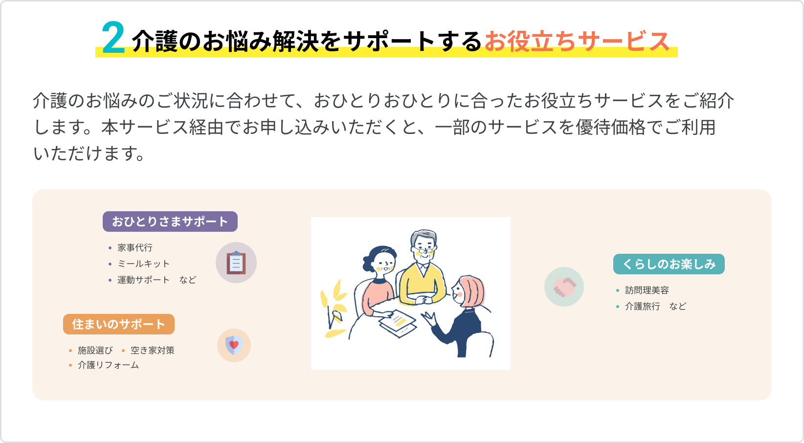 サービスの特徴(2) 介護のお悩み解決をサポートするお役立ちサービス:優待価格でご利用いただけます。