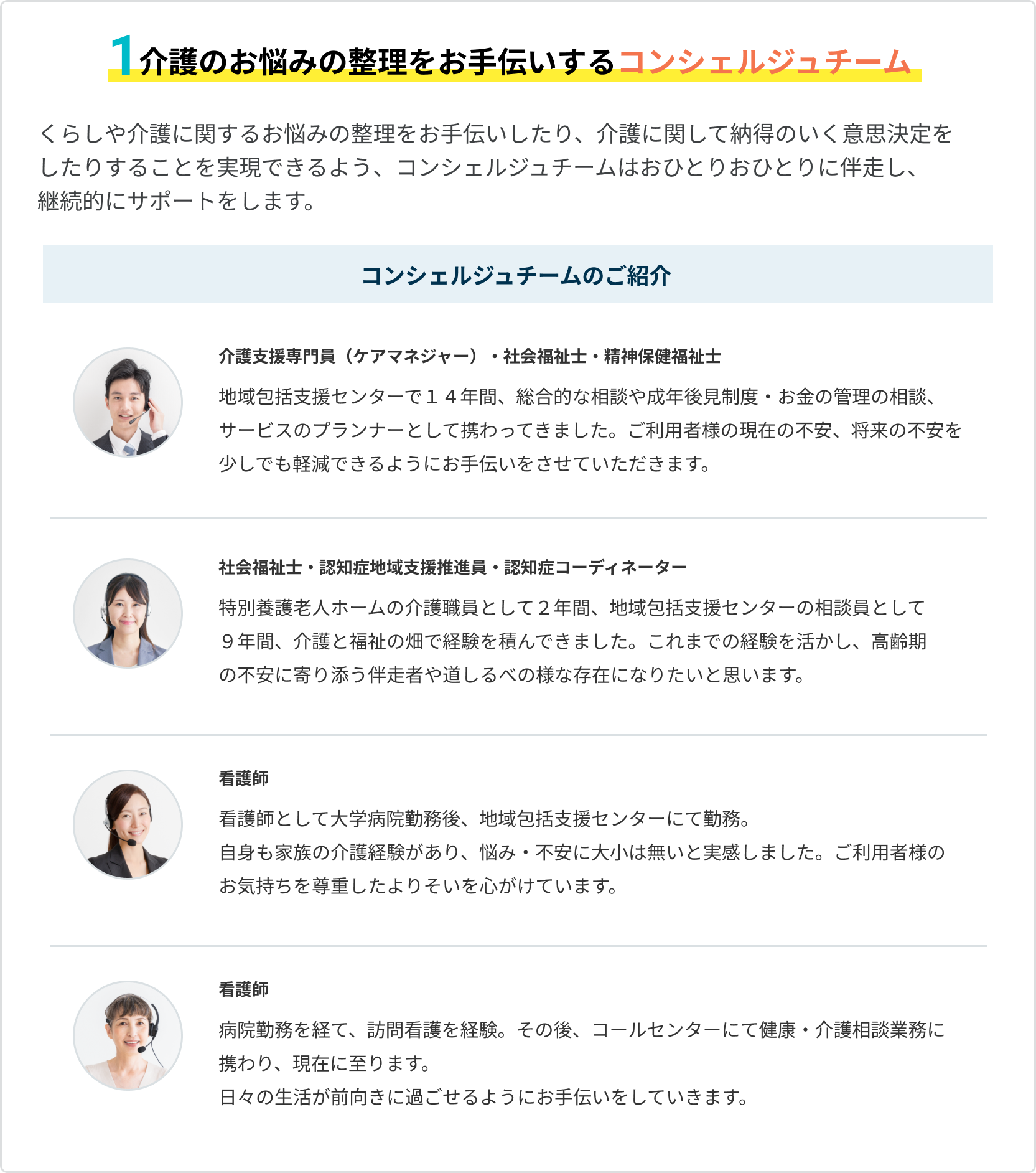介護のお悩みをお伺いするコンシェルジュチームは、介護支援専門員(ケアマネジャー)や社会福祉士、看護師などの資格を持った専門家で構成されたチームです。くらしや介護に関するお悩みの整理をお手伝いしたり、介護に関して納得のいく意思決定をしたりすることを実現できるよう、コンシェルジュチームはおひとりおひとりに伴走し、継続的にサポートをします。