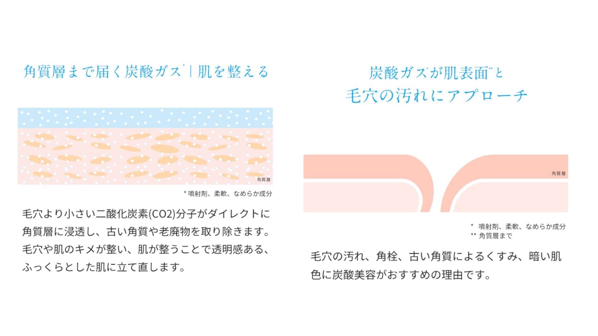 炭酸スキンケアは、肌の表面を整えるだけではありません。毛穴より小さい二酸化炭素(CO2)分子がダイレクトに角質層に浸透し、古い角質や老廃物を取り除きます。毛穴や肌のキメが整い、肌が整うことで透明感アップし、ふっくらとした肌へとサポートします。