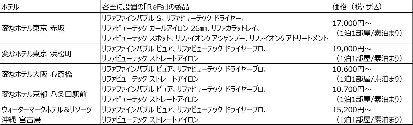 変なホテル東京 赤坂、変なホテル東京 浜松町、変なホテル大阪 心斎橋、変なホテル京都 八条口駅前、ウォーターマークホテル&リゾーツ沖縄 宮古島の5ホテルにて、大人気の美容ブランド「ReFa」の製品を設置した「ReFaルーム」を展開いたします。「ReFaルーム」では「ReFa」の製品を体験し、購入することが可能です。「美」を追求されるお客様にも、仕事後に気軽にご宿泊いただくお客様にもご満足いただける、「美」にこだわった充実したホテル滞在をご提供いたします。「ReFaルーム」には、「ReFa」のシャワーヘッド、ドライヤー、ヘアアイロンを導入し、LEDライト付き三面ミラーを設置、C.O.Bigelowまたは雪肌精のスキンケアセットをご用意しております。さらに、変なホテル東京 赤坂では「ReFa」の美容ロ―ラー、美顔器、シャンプー、トリートメントも導入しております。