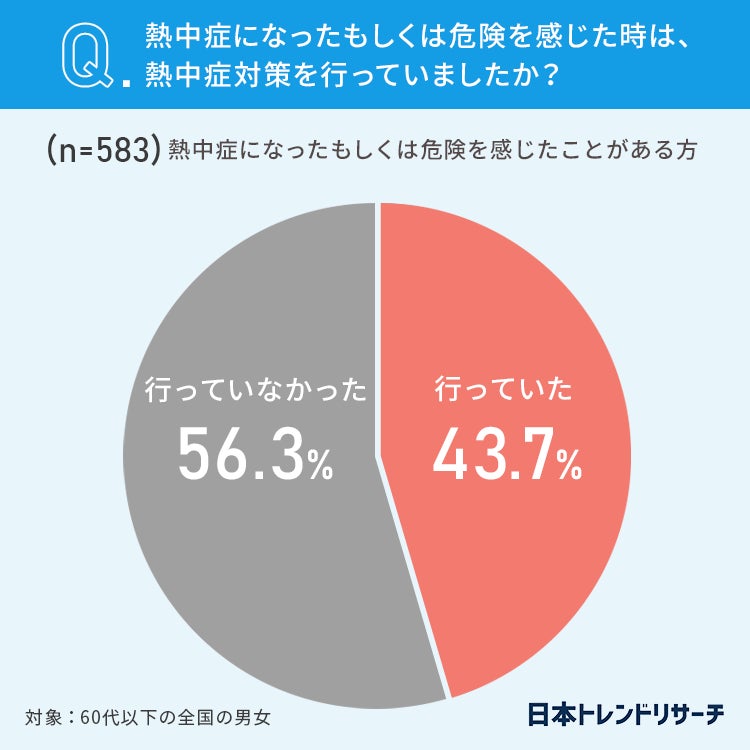 43.7%の方が「熱中症対策を行っていたにも関わらず、熱中症になったもしくは危険を感じた」と答えています。