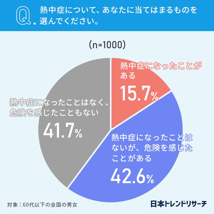 「熱中症になったことがある」が15.7%、「熱中症になったことはないが、危険を感じたことがある」42.6%という結果になりました。