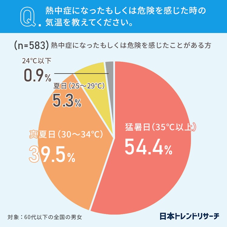 また、熱中症になったもしくは危険を感じた時の気温は54.4%が「猛暑日(35℃以上)」、39.5%が「真夏日(30~34℃)」がと答えています。