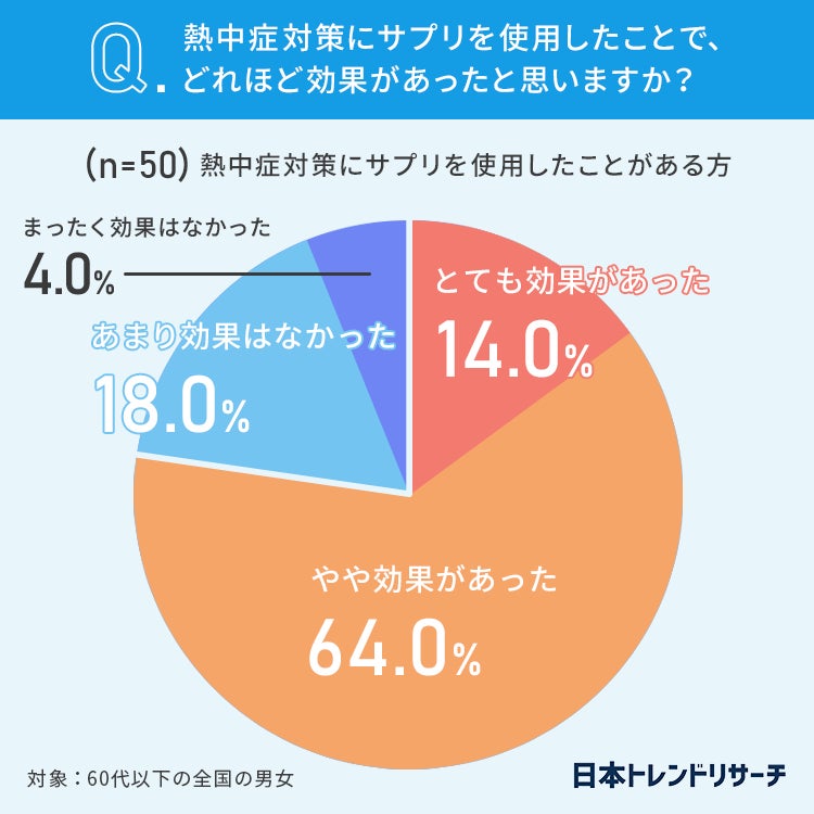 「やや効果があった」猛暑日に熱中症の症状がでなく、適切な汗が出たからです。(60代・女性)