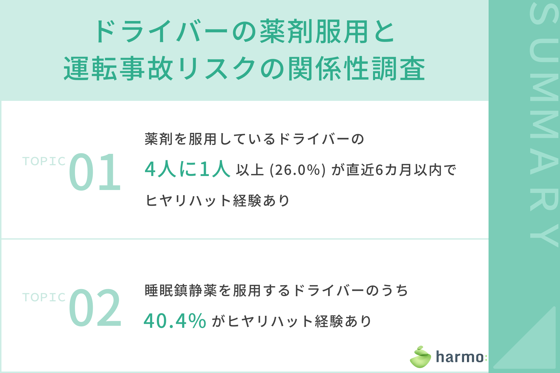 本調査の結果、直近6カ月以内に運転時にヒヤリハット経験「あり」と回答したドライバーは26.0%で、何かしらの薬剤を服用している集団の4人に1人以上がヒヤリハットを経験していることがわかりました。さらに日常的に(週5日以上)運転するドライバーでは30.7%が、特に睡眠鎮静薬を服用するドライバーでは40.4%がヒヤリハットを経験していることが明らかになりました。