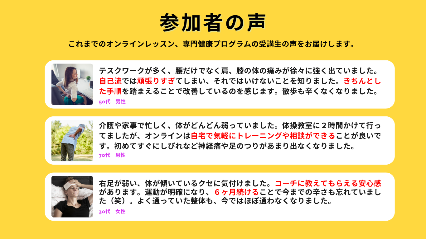 オンラインプログラム参加者より、「運動習慣づくり」と「自分に適した運動と学び」により、体調の改善、痛みの軽減した声をいただいています。