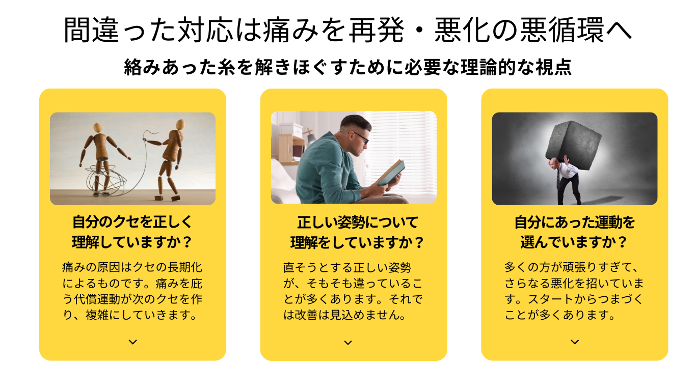 間違った対応は痛みを再発・悪化の悪循環へつながります。