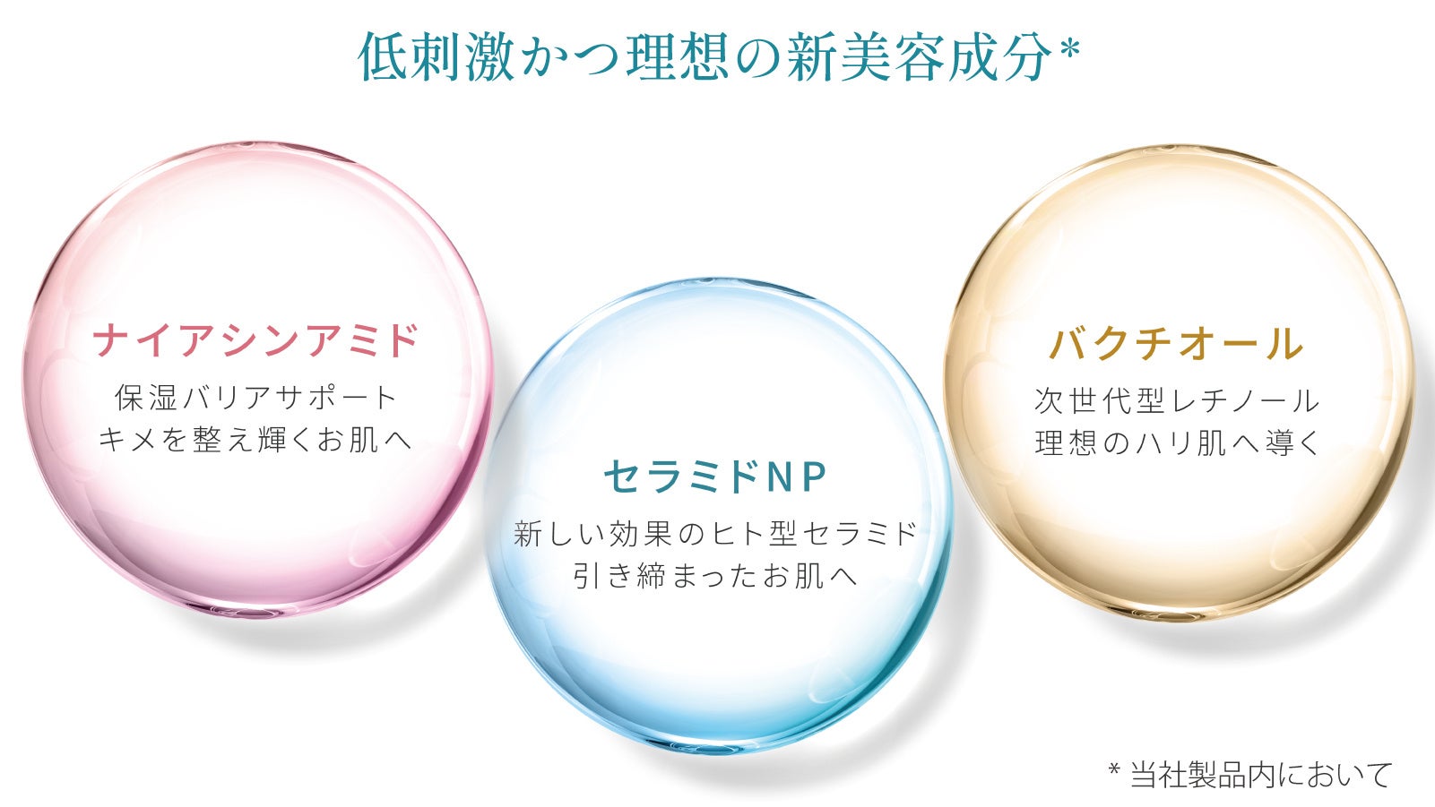 高機能Wセラミド&最新ビタミン類配合で、守りと攻めの両面から輝かしい美肌へ導きます。