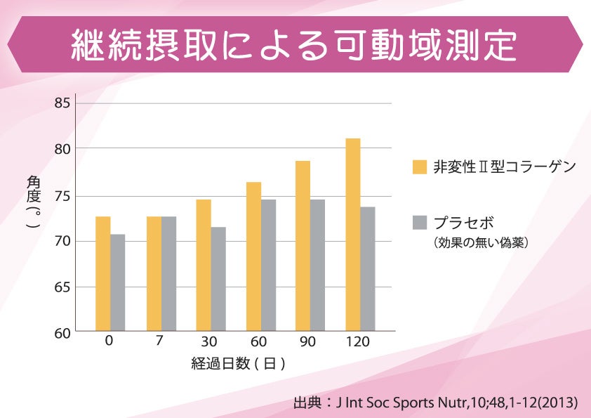 ●非変性II型コラーゲン摂取群27名、プラセボ(効果のない偽薬)群28名に対して、120日間の試験を行なった。(最終製品の試験ではありません)