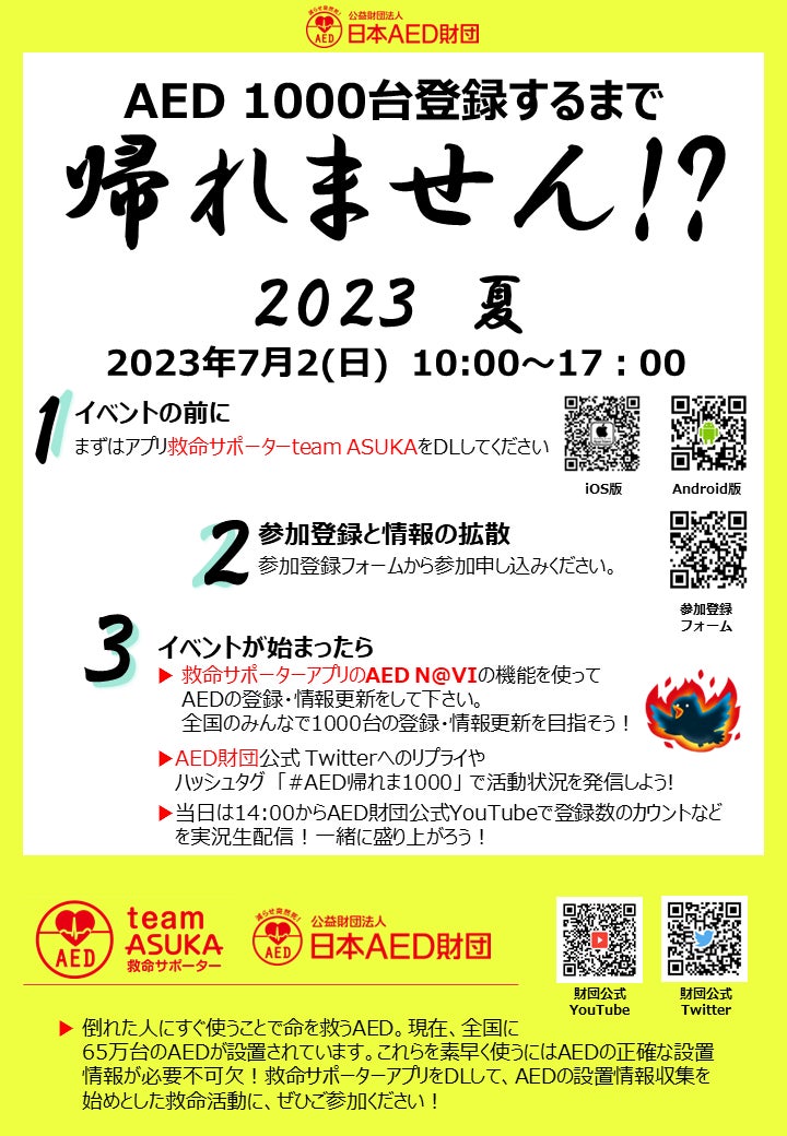 財団公式Twitterも随時更新しますので、リプライや、「#AED帰れま1000」を付けた発信をお待ちしています。