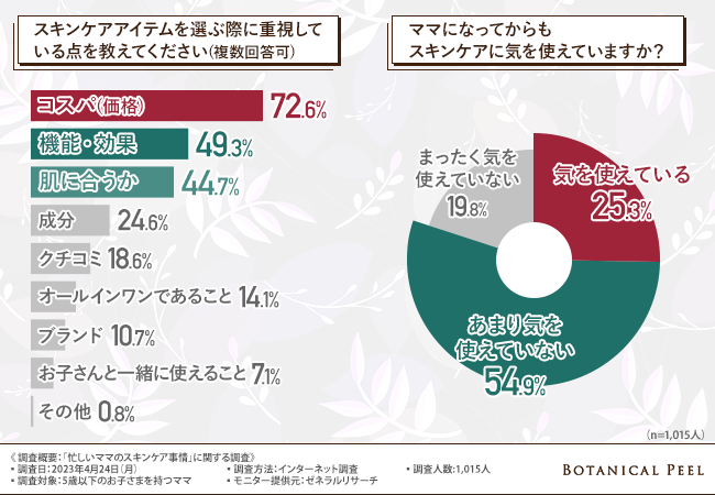 そこで今回、スキンケアブランド『BOTANICAL PEEL』(https://www.botanical-peel.com/)を展開する株式会社CREDEAは、5歳以下のお子さまを持つママを対象に、「忙しいママのスキンケア事情」に関する調査を実施しました。