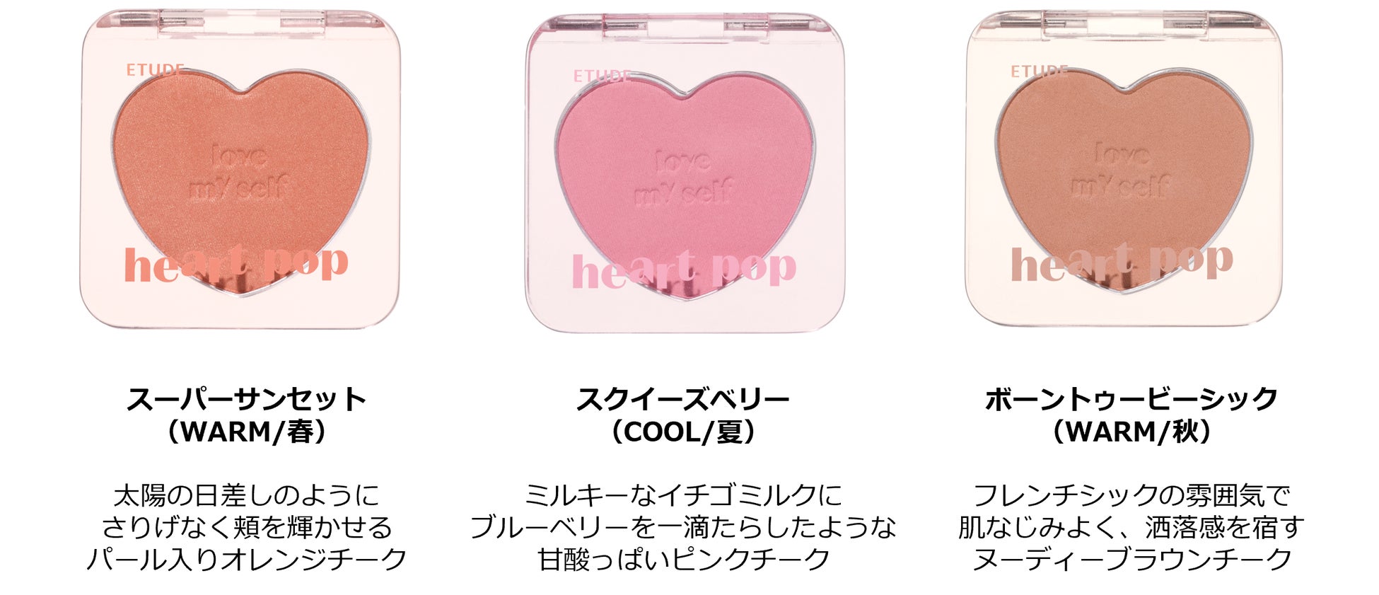 韓国コスメブランド「エチュード」は、内側からにじみだすように血色感あふれる自然光チーク『ハートポップブラッシャー』を、2023年6月23日(金)よりエチュード公式オンラインストアにて先行発売いたします。