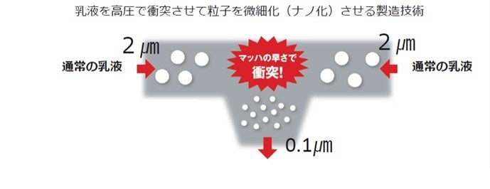 エアゾールタイプの化粧品には、LPGガスや窒素ガスを用いたものがあります。LPGガスを使用したものは、噴霧した際の粒子が細かく、肺などに吸入した際に健康を害する恐れがあるため、顔に直接使用することができません。窒素ガスは、LPGガスよりも粒子が粗いために、直接顔に噴霧することができます。今まで、一般的に窒素ガスを使用した化粧水は存在しましたが、乳液状の化粧品をエアゾールのスキンケア品として確立したのは、当社が初めて※です。化粧品開発において、油分と水分を混ぜ合わせることは基本の技術ですが、本来混ざることのない水と油を混ぜる方法は、各社の技術が異なります。当社が今まで行ってきたのは、水分に油分を多く含ませるオリジナルの高圧処理技術で、高圧処理した油分を化粧水に希釈するものでした。今回、当社としては初めて、希釈せずに約20%の油分を含んだ乳液を開発することに成功しました。当社の化粧水は、1%~2%の油分の配合量が通常であり(極一部の化粧水では3%程度のものがあります)、約10倍の油分を配合できたことになります。この高圧処理技術は、オイル状のべたつきを軽減することができるため、油分が多いにも関わらずべたつきのない良い使用感を実現します。この乳液をスプレーで噴霧できる技術を確立したことで、短時間で、心地よいスキンケアをすることができます。