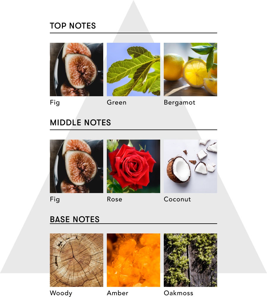 フィグとフィグリーフを合わせることで、青さもありながら、鼻の奥に甘さも感じられるグリーン調の香りに、フレッシュなベルガモットをあわせたトップノート。徐々にミルキーな甘さやウッディーが姿を表し、最終的にはグリーン・フローラル・ウッディの香りに仕上がります。肌にも嬉しい植物由来のアルコールです。