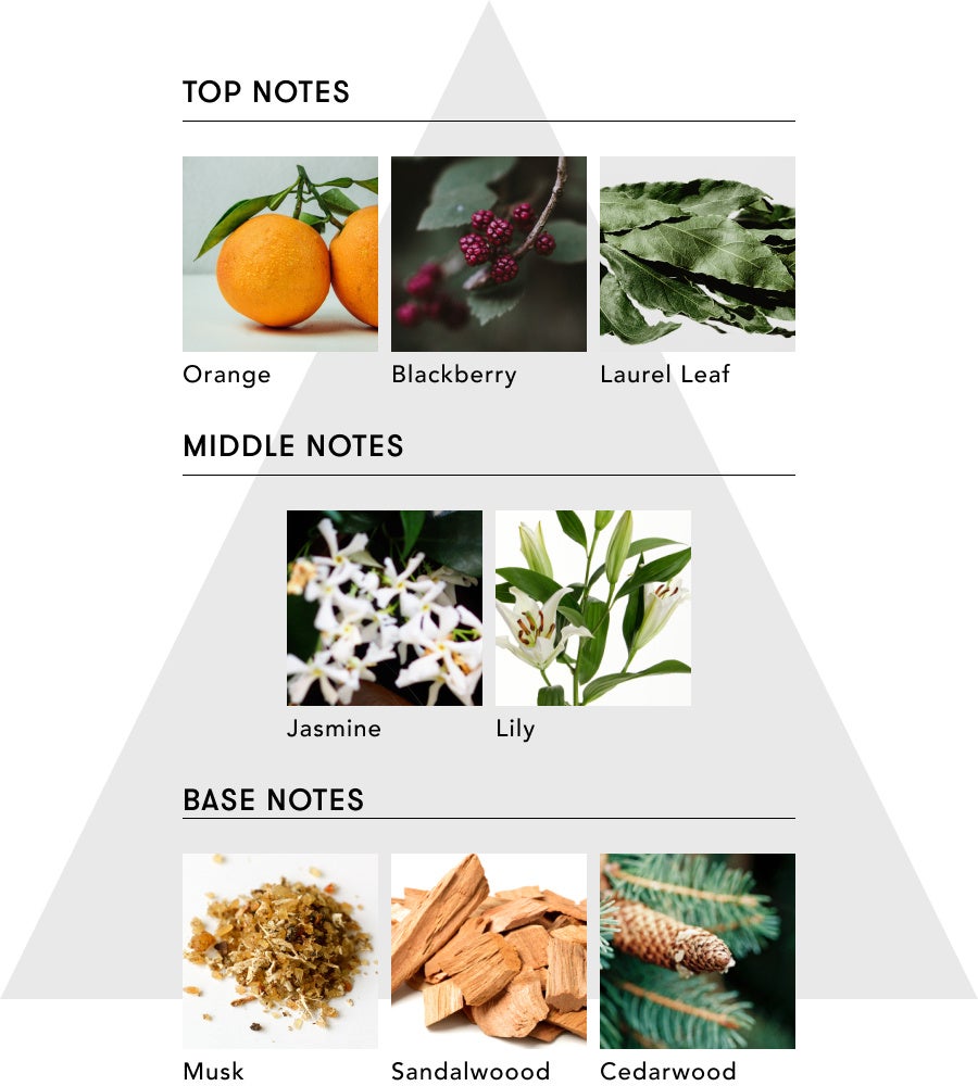 少し酸味のあるブラックベリーに、朝摘みのローリエの葉の繊細さをON。一転、落ち着いたムスクとサンダルウッドやセダーウッドのウッディーな香りが全体に厚みを加え、存在感のある上品でフルーティーな香りに仕上がり、繊細な余韻を描きます。肌にも嬉しい植物由来のアルコールです。