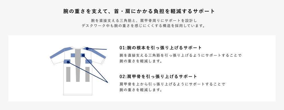 腕の重さが原因で起こりやすい「首こり・肩こり」、姿勢を正すことによって生じる「背中の疲れ」、この2つの負担を軽減した独自構造です。また、肩甲骨を引き寄せるサポートにより、肩から首にかけてのサポートと胸を開く効果もあります。また、正しい姿勢を維持するために使用する筋肉部位をサポートします。