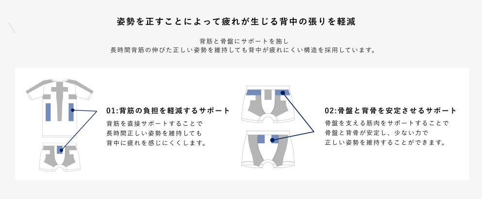 本製品はデスクワーク時の理想の座位姿勢をサポートできるように設計されたインナーウェアです。理学療法士監修の下、合計12箇所のサポートを施し、ボトムスが骨盤の前傾を、トップスが背骨などをサポートするよう設計されています。
