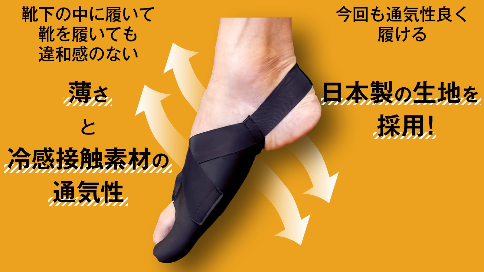 より快適に長時間履けるように、一般的な足袋タイプのサポーターのように足の又にかけるのではなく、3つ又部分を指の間に食い込まないデザインへ改良。足指の自由な動きが制限されることなく地面をしっかり捉えての歩行が可能になりました。