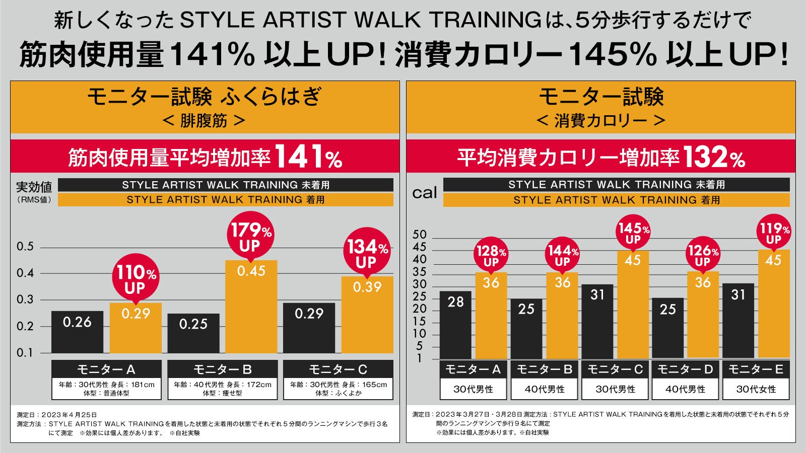 『STYLE ARTIST WALK TRAINING』を着用して5分間ランニングマシンを歩行したところ、未着用の時と比較して筋肉使用量が平均141%に増加。さらに、消費カロリーも最大145%になる結果も出ており、偏平足で疲れやすい方や、日頃忙しくて運動ができない方に最適なアイテムとなっています。