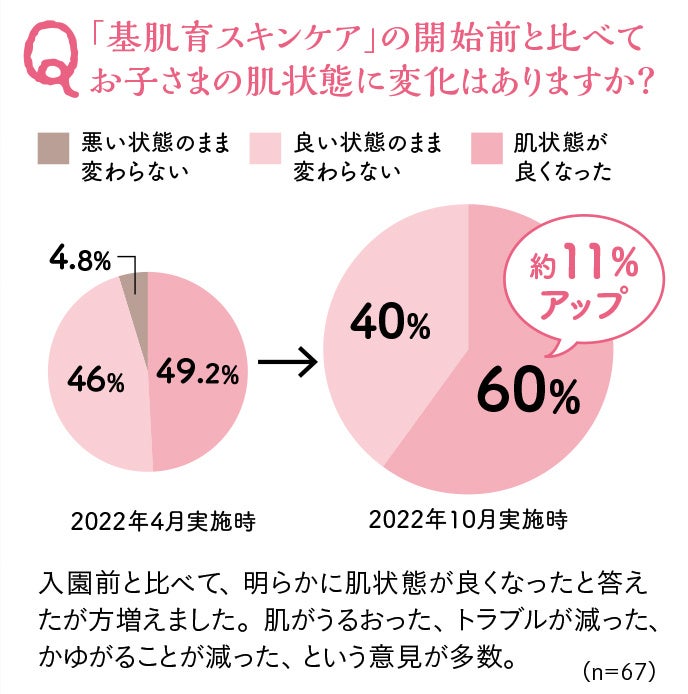 また、保育園での長年の調査より、保育士さんから「スキンケアを通して子どもの見通す力(かゆくならないように保湿をすればいいといった考え方)が培われている」、「肌と肌とのスキンシップなどの効果か、とても情緒が安定しているように感じる」といったお声をいただいています。子どものスキンケアの、肌荒れ予防以外のメリットも引き続き調査したいと考えております。