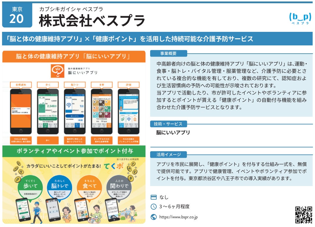 『STARTUP CATALOG 2023』では、ベスプラの脳科学に基づいた脳の健康維持アプリ『脳にいいアプリ』と『健康ポイント』を組み合わせた介護予防サービスが紹介されました。このカタログは広島県のスタートアップ共同調達推進事業の一環として作成され、ベスプラの取り組みが注目されています。