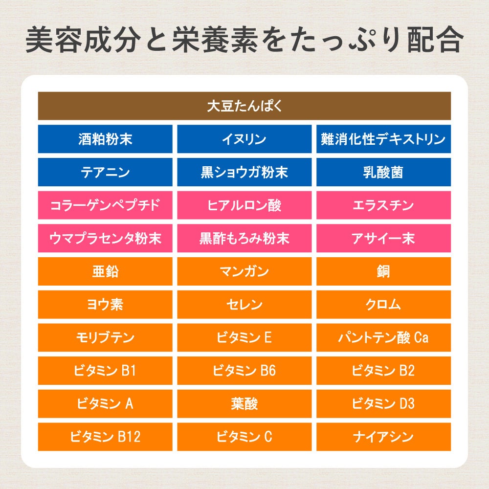 美容目的でも使われる日本酒独特の成分「α-EG」と、酒粕や大豆に含まれる体のお掃除屋さん「レジスタントプロテイン」のほか、女性が不足しがちな栄養素が豊富に詰まった粉末プロテインです。酒粕は国内酒造メーカーのものを使用しています。