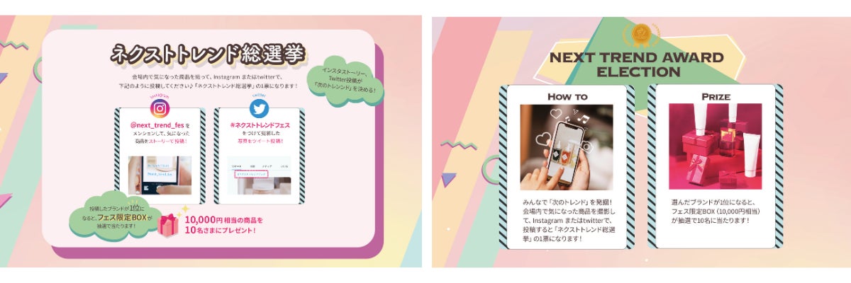 会場内では、次なる流行を決める「ネクストトレンド総選挙」を実施。InstagramまたはTwitterでこれからトレンドになりそうと思った商品の写真を投稿することで、参加することができます。一般来場者からインフルエンサーまでそれぞれがプロデューサーとなって、各ジャンルごとにネクストトレンドを決定しましょう!投稿は複数回OKのため、たくさん投稿するほど当選確率UP!結果はイベント最終日の4日(日)に、ステージにて発表します。