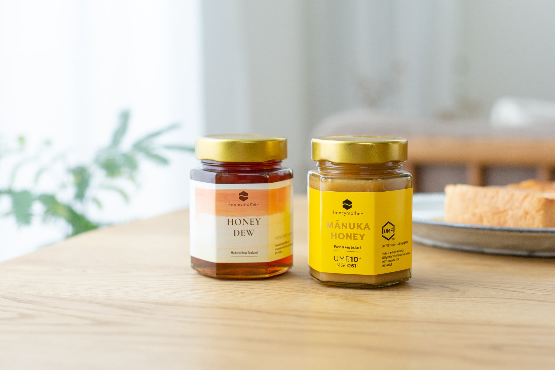ニュージーランドの大自然に咲く、さまざまなワイルドフラワーの蜜を集めた百花蜜「フォレストハニー」(左)と、森の小さな虫たちが集めた樹液をみつばちが熟成した「ハニーデュー」(右)。