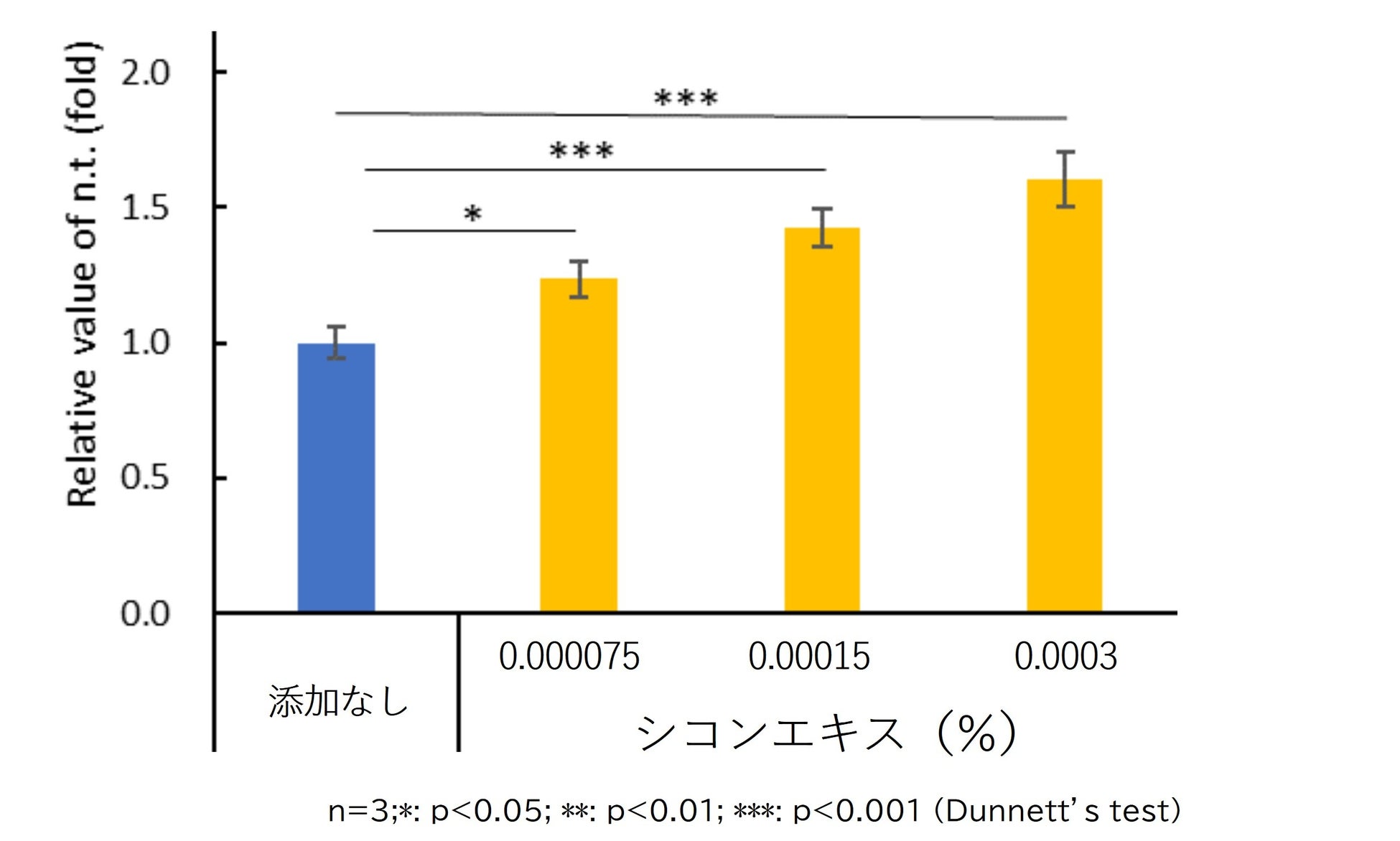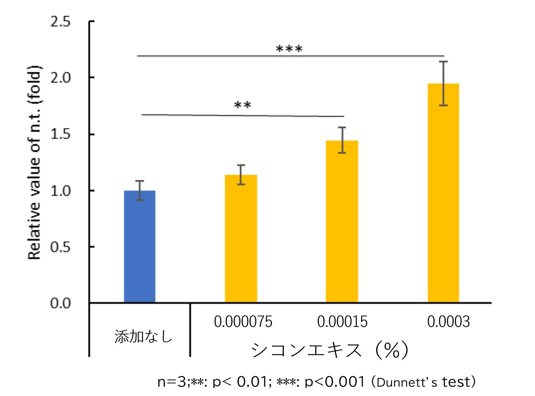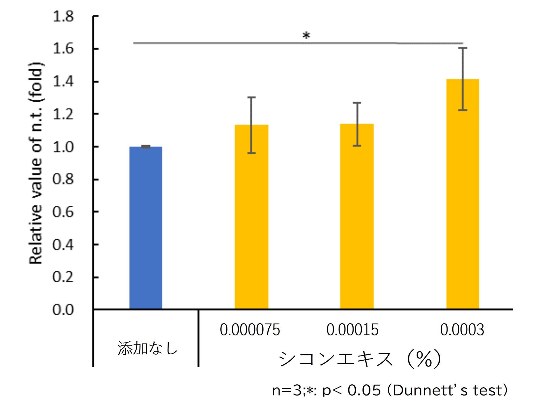 バリア機能形成能の評価として、ヒト表皮角化細胞(NHEK)を用いてシコンエキス添加によるバリア機能形成に関連する遺伝子発現量の評価を行いました。シコンエキスの添加によりFLG、IVL、TGM1、CERS1の遺伝子発現量が有意に増加し、シコンエキスはバリア機能亢進に寄与することが示唆されました。(図2~5)
