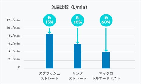 ミラブルzeroは、目に見えない程の超微細な気泡、ウルトラファインバブルで汚れを落とすだけではなく、エネルギーコストが高騰し家計を圧迫する中、嬉しい節水効果があります。特殊な「空気混合方式」を採用することで、同じ水圧でも水の使用量を大幅に節約することに成功しました。トルネードミスと水流で約60%、リングストレート水流で約40%、スプラッシュストレート水流で約15%の節水に成功しています。水量が少ないのに、しっかり洗浄できることもミラブルzeroの特徴です。