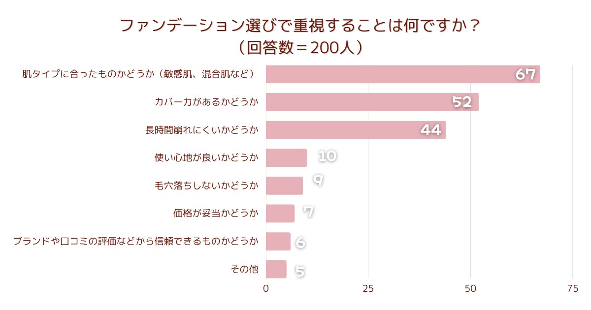 「ファンデーション選びで重視することは何ですか?」とアンケート調査した結果、1位は『肌タイプに合ったものかどうか(敏感肌、混合肌など)』でした。