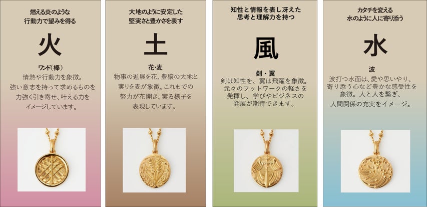 エレメントとは、12星座を区分する4つの価値観。自分の星座に対応するモチーフを選ぶことで、生まれ持った運命をより活かしやすくし、運気全体の底上げになります。叶えたい願いから選ぶことも可能。より自由に自分らしく運を切り開くエレメントで選ぶ“アテニア”だけのお守りコインジュエリー。
