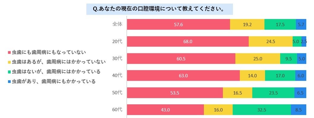 今回の調査によると、実に42.4%もの女性が現在、虫歯か歯周病を患っていることがわかりました。また、年代が上がるにつれて口腔環境は悪化し、60代女性の4割以上が歯周病にかかっているようです。歯周病は高齢者の病気というイメージを持ちがちですが、30代女性の1割以上、40代女性の2割以上が歯周病にかかっており、若者も油断できないといえるでしょう。