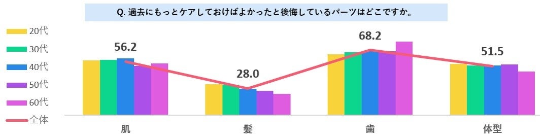 以上のように、オーラルケアの重要性をわかっていながらも、特に若いうちはケア不足に甘んじてしまう結果、過去に「歯」をもっとケアしておけばよかったと後悔している女性が68.2%もいることがわかりました。これは、「肌」「体型」「髪」を抑えて第1位でした。「髪」と「体型」の後悔は20代女性が最も多いのに対し、「歯」は年代が上がるにつれ多くなっており、「髪」や「体型」のケア不足は気にならなくなっていくが、「歯」は後悔が募っていくようです。