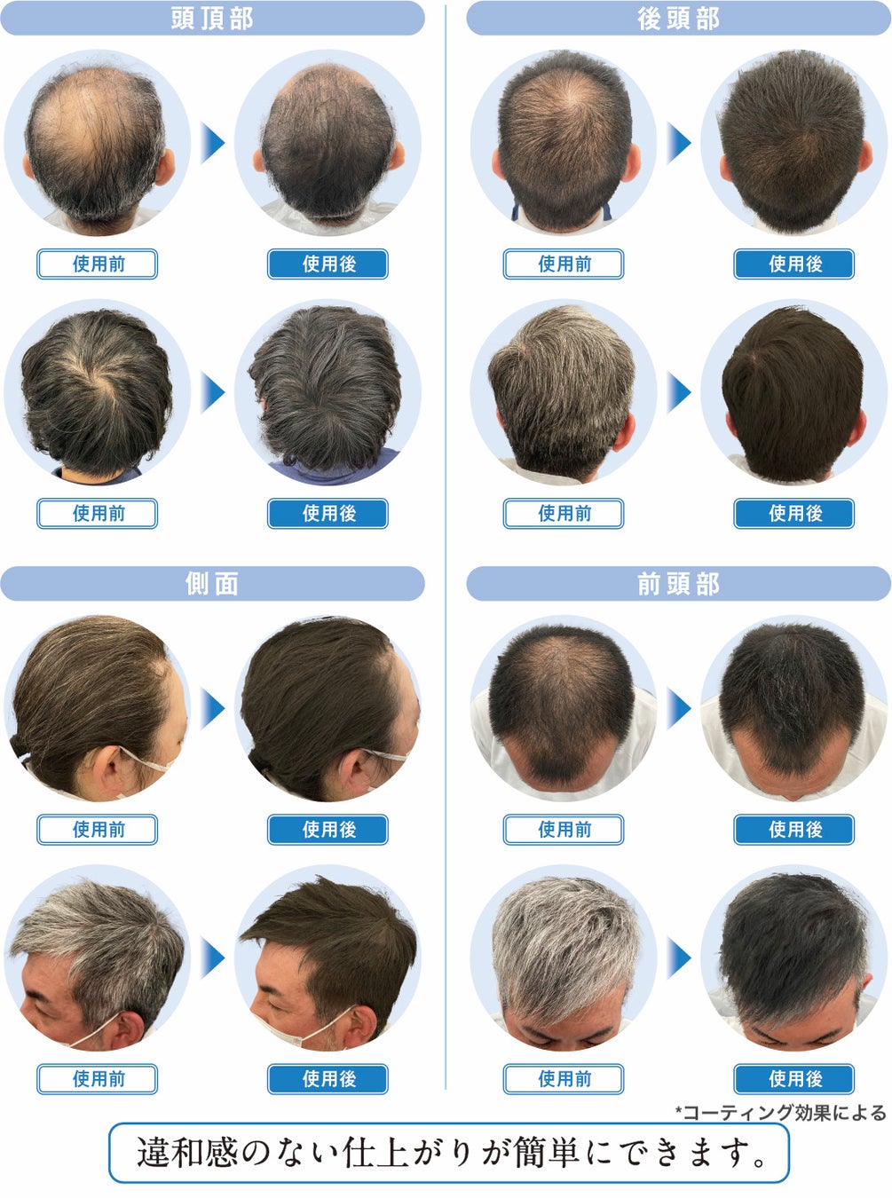 本製品は、ミクロの微粉末(シリカ*1 )が髪をコーティングし、髪1本1本を太く黒く見せ、薄毛を目立たなくすることで、自然なボリュームアップに見える仕上がりになります。