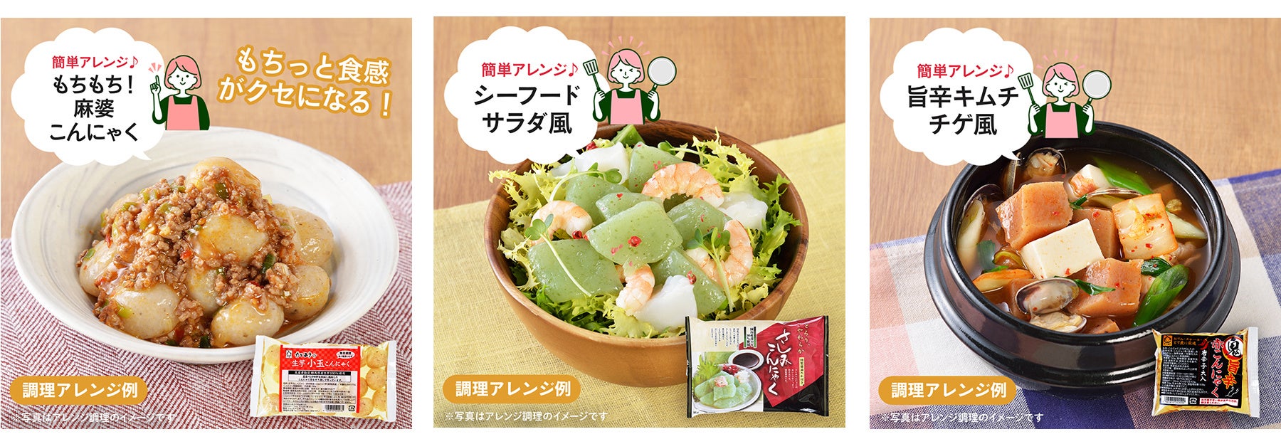昔ながらの製法でつくるこだわりの伝統を守りながら、現代の食生活に合わせたミールキットなどを開発し、「こんにゃくマルシェ」として新たなこんにゃくの魅力を発信し続けております。商品のアレンジレシピも和洋中、スイーツまで!ぜひ、ご賞味ください。
