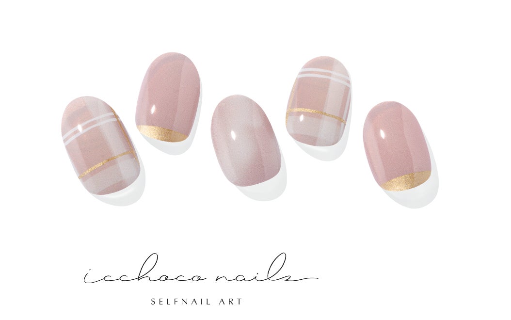 人気ネイルサロンとコラボしたワンランク上のデザイン。少しスモーキーなピンクをベースにゴールドラインを足し、落ち着いたムードに仕上げています。カジュアルになりすぎず、大人のかわいらしさを印象づけます。